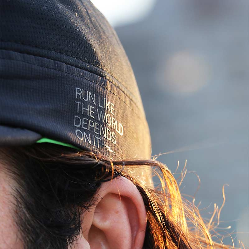 Our RUN LIKE THE WORLD DEPENDS ON IT x Fractel M-SERIES running cap is a step forward.