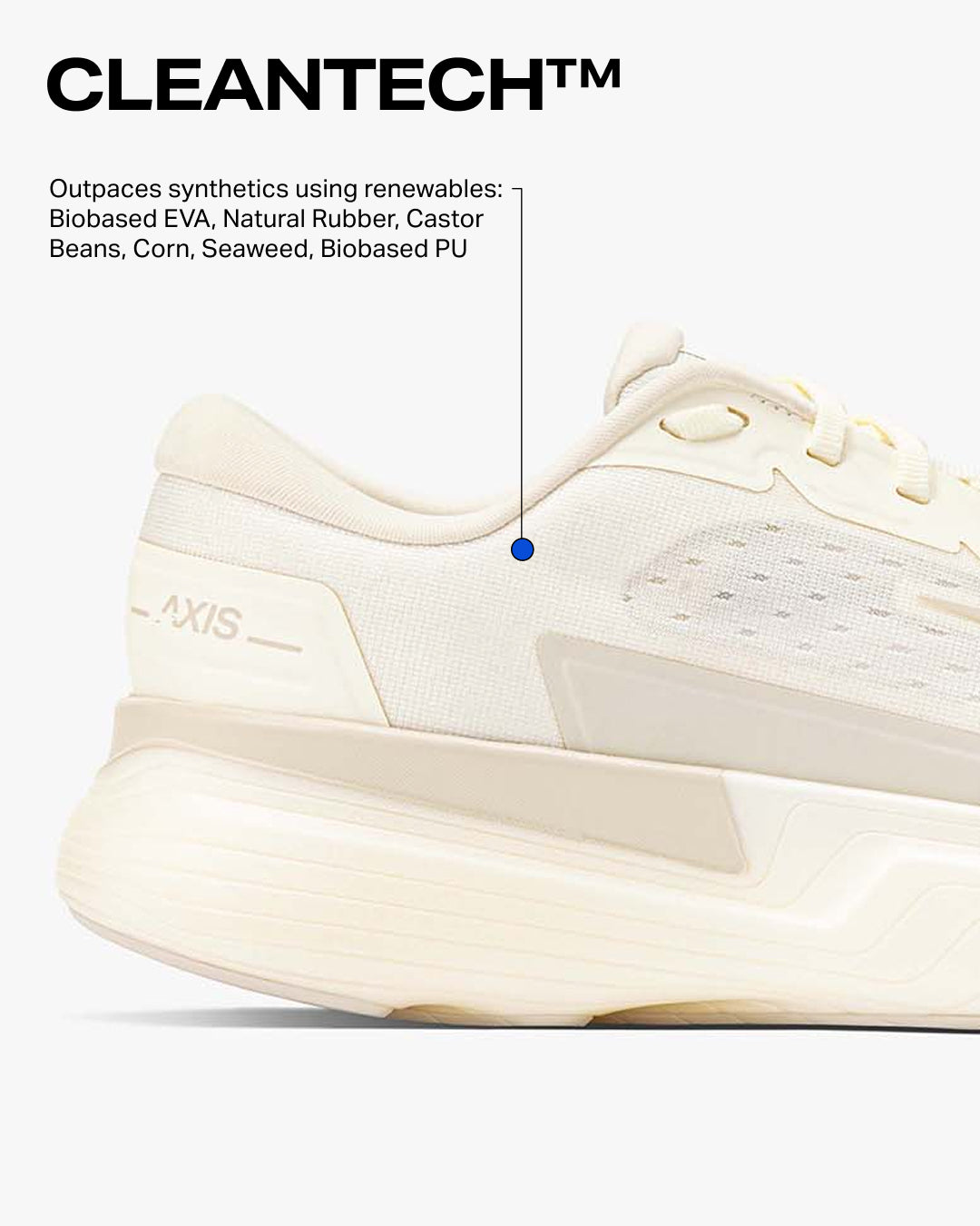 50% bio-based Hyperbolt+™ supercritical nitrogen-injected foam with added bio-EVA for extra cushion at foot strike and push takeoff.