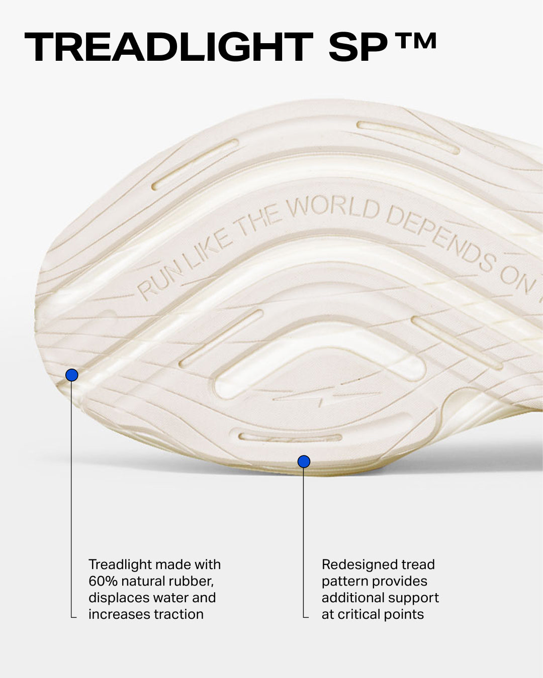 60% natural rubber TreadLight™ displaces water and increases traction. Redesigned tread pattern provides additional support at critical points.